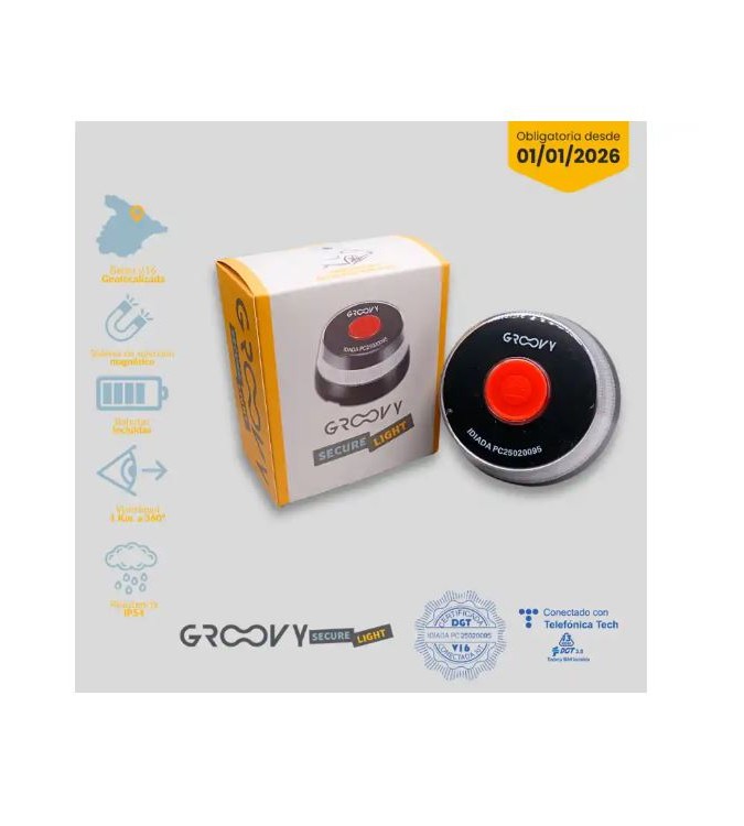 El Groovy Secure Light es un dispositivo V16 totalmente homologado, que cumple con la normativa exigida por la DGT para señalización en emergencias desde 2026.
