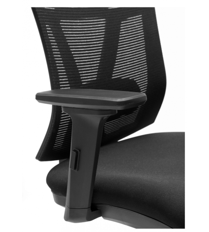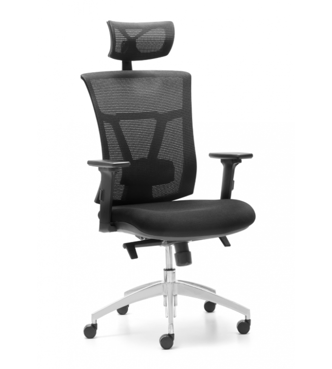 Incorpora cabecero de serie, en bastidor tapizado con malla “efecto tela”, regulable en altura e inclinación.