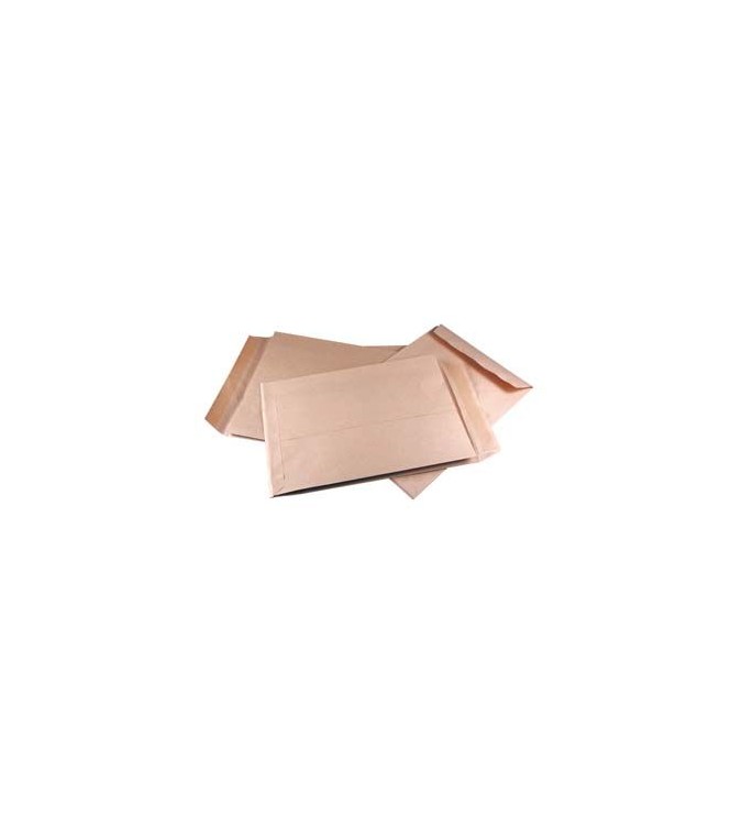 Bolsas en papel verjurado de 130g color kraft natural extra con fuelle lateral de 35mm. Para envíos de volumen.cierre autodex. Presentado en caj de 100 unidades.