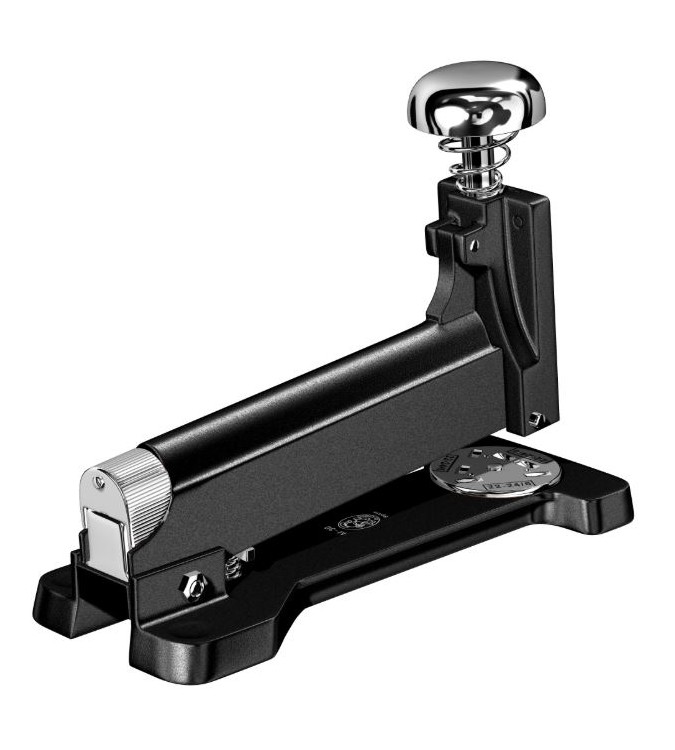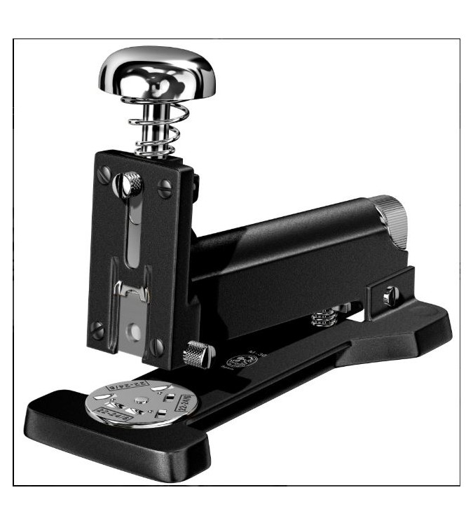 Grapadora de gran capacidad, lacada en negro con acabados en baño de cobre níquel y cromo brillante.
