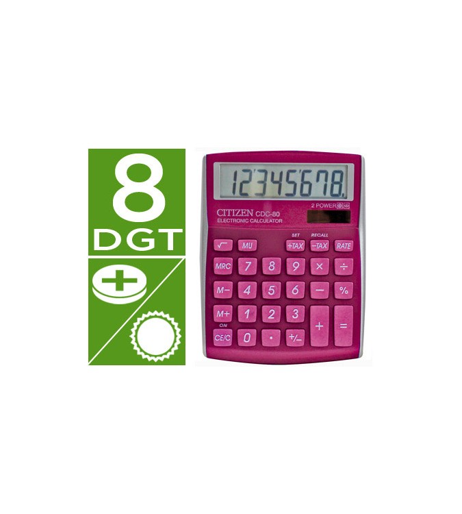 Calculadora citizen sobremesa cdc-80 8 digitos rosa brillante. Calculadora de sobremesa. Tecla de margen de beneficio. Raíz cuadrada. Suma y resta de memoria. Alimentación solar y a pilas. Eco eficiente. Tecla de porcentaje. Cálculo de impuestos. Medidas: 135 x 109 x 23,3 mm. Peso: 105 g.