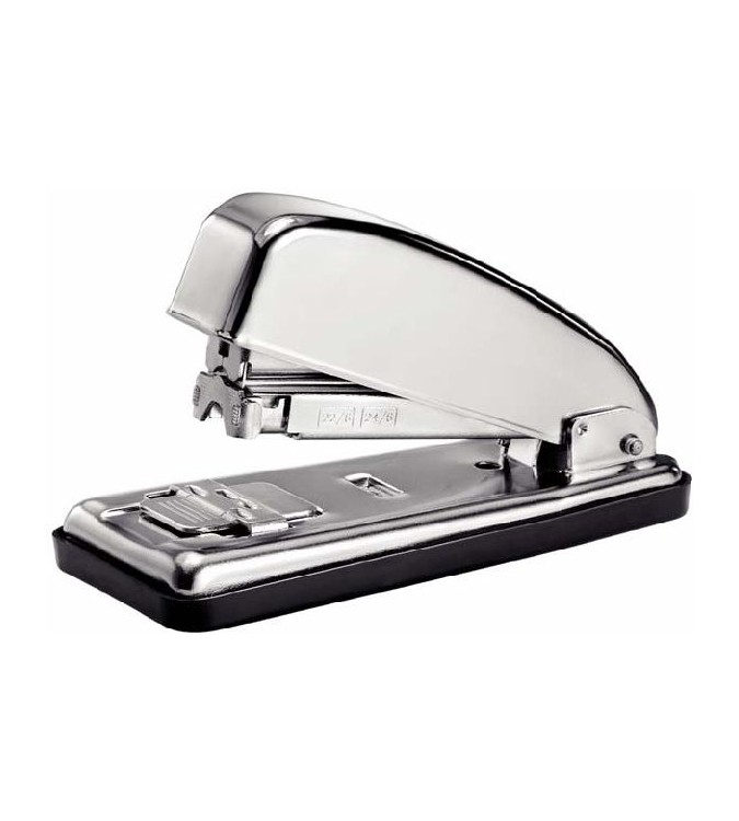 Grapadora metálica de línea clásica. Apertura frontal automática antibloqueo, boca reforzada, cargador doble guía y grapado abierto y cerrado. Cubeta plástica antideslizante. Capacidad para 30 hojas. Grapas 22/6 y 24/6.
