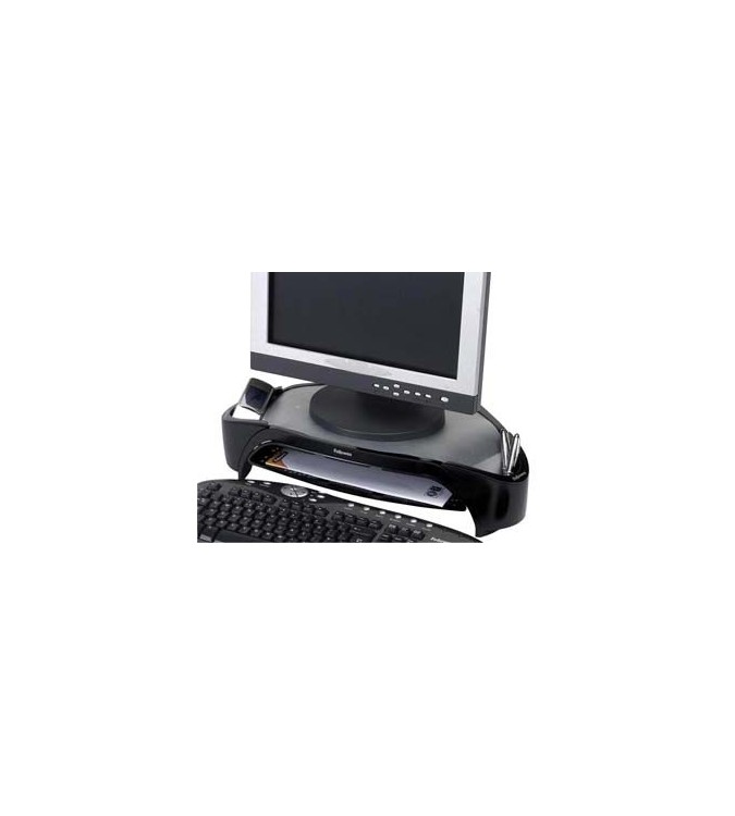SOPORTE MONITOR PLUS 103X497X330MM Ajusta la pantalla a la altura de los ojos para prevenir malas posturas. Diseño triangular, incluye 2 compartimentos y una bandeja porta-documentos. Ajustable a 3 alturas. Soporta monitores tft hasta 21" o hasta 18kg.