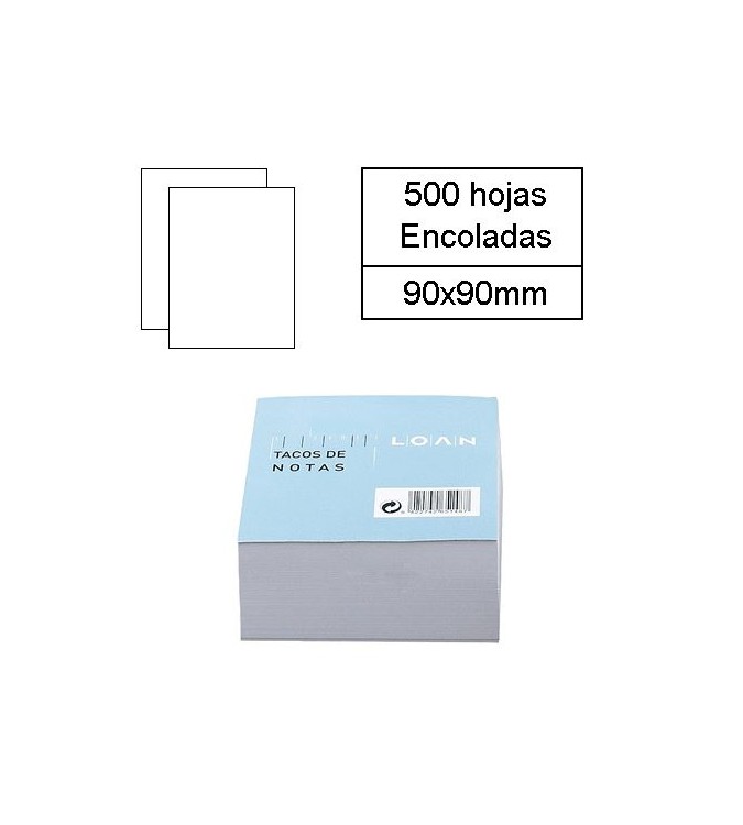 Taco de notas de 9x9cm de 500 hojas encoladas en color blanco.