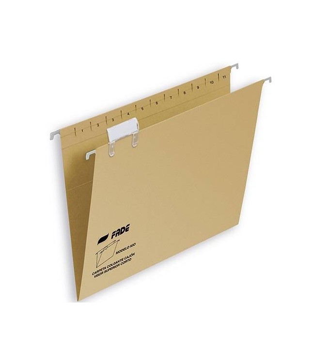 Carpeta colgante con visor superior de 80mm. extraible y efecto lupa. Con varilla de alambre con terminales de plastico. Lomo en V. Fabricada en kraft eco de 220g. Carpeta colgante con visor superior varilla metalica fade folio.