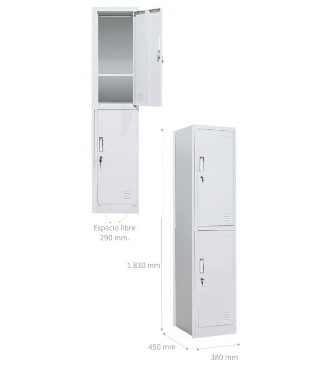 Incluye barra de acero inoxidable para colgar perchas y un estante en cada departamento.