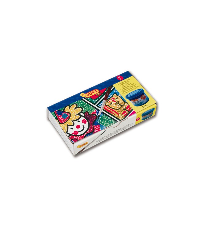 Témpera de 7 botes. Colores: amarillo, azul, blanco, marrón, negro, rojo y verde. Incluye pincel. Ideal para utilizar en papel, cartulina, madera, tela, pasta para modelar y arcilla.