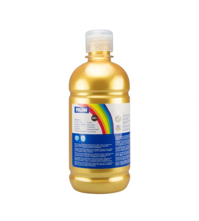 Botella de 500 ml con tapón dosificador, color metalizado oro. Témpera fabricada con pigmentos de calidad y resistentes a la luz. Los colores son vivos y puros gracias a su composición. Sus colores se pueden mezclarpara crear nuevos tonos. La pintura tiene una viscosidad y poder cubriente excelentes. Está lista para usar y ofrece un óptimo rendimiento. Puede diluirse en agua para conseguir tonos más ligeros y un acabado acuoso. Se seca rápidamente.