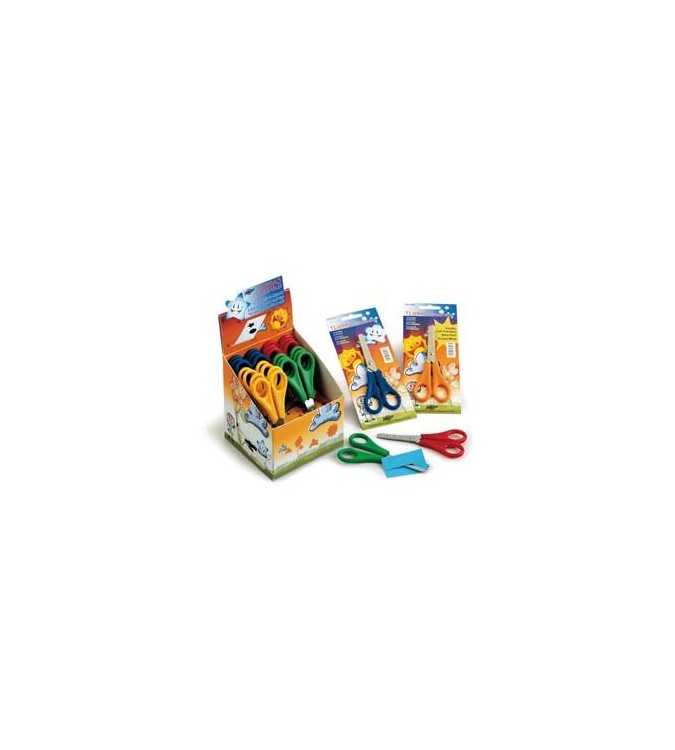 Tijera escolar de acero inoxidable con empuñadura de plástico y punta roma.