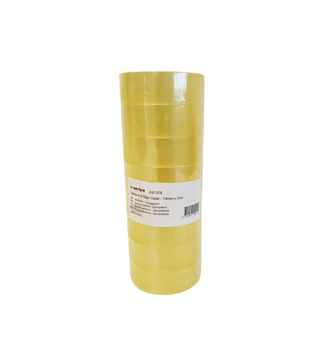 Cinta adhesiva 19 mm x 33 m en bolsita. Cinta transparente de tono ligeramente amarillo, acabado brillante